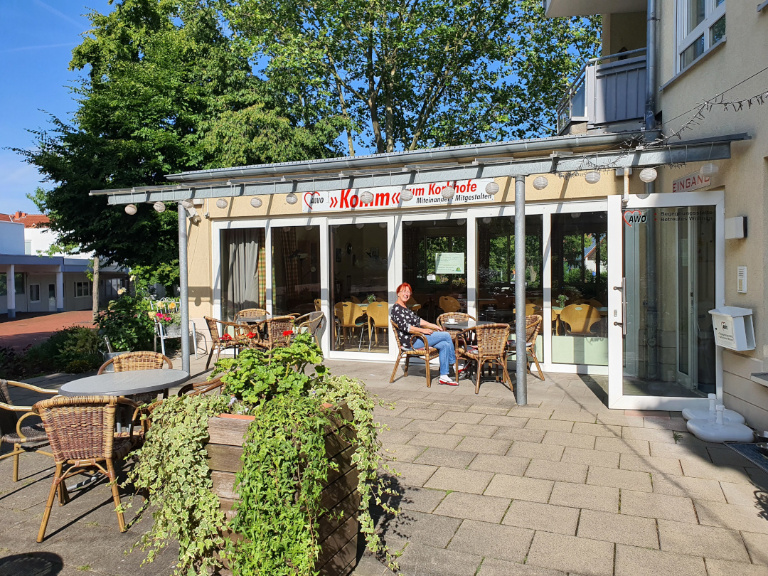 In der Anlage befindet sich auch eine Begegnungsstätte der AWO. So ist der Weg zur wöchentlichen Gymnastik oder dem Singkreis, der Malgruppe oder der Doppelkopfrunde und vielen anderen Angeboten nur einen Katzensprung entfernt. Oder man genießt in unserem Café „Komm“, welches von Ehrenamtlichen geführt wird, Kaffee und selbstgebackenen Kuchen und findet dort immer jemanden für eine Unterhaltung.